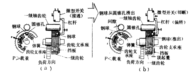 圖b為超負荷狀態(tài),符合扭矩超過彈簧力時,二級軸齒輪和一級軸齒軸分離,鋼球從圓錐孔推出,擋板被頂出。擋板推動杠桿偏轉時,操作回路的微型開關切斷,停止運轉。