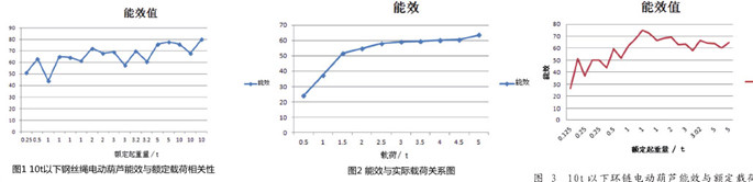 在對不同規(guī)格,不同型號的環(huán)鏈電動葫蘆的能效值進行對比的同時,還收集了同1臺葫蘆在從輕載到額載工況下,能效隨試驗載荷變化而變化的試驗數(shù)據(jù)。經(jīng)過對數(shù)據(jù)的分析,圖2列舉了一臺5t的雙速環(huán)鏈電動葫蘆能效隨載荷變化的變化曲線,此曲線具有廣泛代表性。根據(jù)曲線趨勢,可得出以下結(jié)論,鋼絲繩電動葫蘆在吊載不足30%額定起重量的載荷時,其能效值很低,大量能量均被浪費,當?shù)踺d重物超過30%額定起重量的載荷時,電動葫蘆的能效值會有顯著提升,并逐漸趨于高能效值,直至吊載重物超過50%額定起重量,能效值變化非常微小,趨于穩(wěn)定。