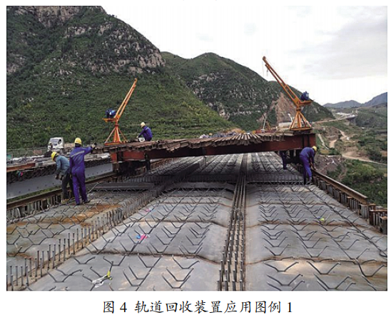 該軌道回收裝置用于鋼混橋梁架橋機(jī)架設(shè)完畢后,架橋機(jī)的軌道回收,利用旋轉(zhuǎn)中心軸、第一旋轉(zhuǎn)托盤和第二旋轉(zhuǎn)托盤可實(shí)現(xiàn)吊具的360毅旋轉(zhuǎn)作業(yè),作業(yè)方便快捷,使用安全可靠,操作易控制,自重輕、施工快速,避免了物品回收時的人工轉(zhuǎn)運(yùn)時耗,有利于施工成 本的節(jié)約?;喌蹉^裝置通過定滑輪、起吊電動葫蘆和 鋼絲繩作用,可實(shí)現(xiàn)架橋機(jī)軌道的高效回收。與現(xiàn)有技術(shù)相比,該應(yīng)用于鋼混橋梁安裝架橋機(jī) 軌道回收裝置的設(shè)計結(jié)構(gòu)簡單、使用方便快捷、安全可靠、易控制和成本低,采用該回收裝置規(guī)避了傳統(tǒng)人工進(jìn)行軌道回收的耗時且效率低下問題;提升了架橋機(jī)軌道回收的效率;規(guī)避了人工回收軌道的安全隱患;快捷方便且縮短了鋼混橋梁的架設(shè)工期。