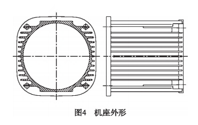 機座外形如圖4所示。取消上部葉片以滿足定子外徑的需要,下部葉片也相應取消,一方面是為了對稱設計,減少機座變形,同時也是美觀的需要;另一方面,下部機座外形平整,便于電機運輸、裝配和維護等。兩側葉片采用水平方向葉片,外形協調美觀。機座采用鋁合金壓鑄件,壓鑄件尺寸精度較高,一般為IT5-IT7,可以減少毛坯的加工余量,減少切削工作量;鋁合金材料利用率高,既節(jié)約材料又節(jié)省加工工時;壓鑄件表面粗糙度小,一般可達到3.2-0.8,有良好的外觀質量;壓鑄件抗拉強度高;壓鑄件質量穩(wěn)定,可滿足大批量生產。