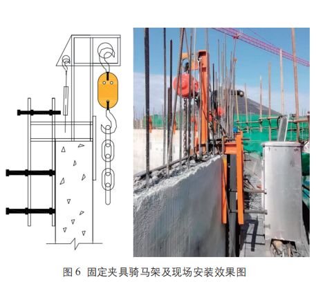 (1)用塔吊將固定夾具騎馬架、電動(dòng)葫蘆吊裝到檐溝操作平臺(tái)作業(yè)面處。固定夾具騎馬架騎扣在倉壁鋼牛腿預(yù)埋件的正上方。在每個(gè)固定夾具騎馬架馬頭上掛鉤孔掛 1 個(gè) 6.8T 電動(dòng)葫蘆,本項(xiàng)目共設(shè)計(jì)26個(gè),其數(shù)量依據(jù)為荷載:桁架23.58T+模板、鋼管、扣件、施工荷載 15.78T=39.36T ;電動(dòng)葫蘆起重荷載6.8T,葫蘆荷載減半計(jì)算為3.4T,39.36/26=1.52T,所以選擇 26 個(gè) 6.8T 的電動(dòng)葫蘆足以滿足施工要求(見圖6)。
