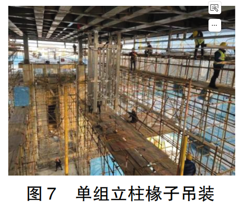 單組鋼立柱椽子的吊裝:單組椽子通過轉(zhuǎn)運車運至安裝位置,電動葫蘆緩緩吊起構(gòu)件,然后操作電動葫蘆垂直運至安裝位置,操作工站在支架上安裝構(gòu)件。為減少電動葫蘆提升時間,4 名操作工人同時站在4個角部進行螺栓安裝作業(yè)。構(gòu)件與桁架下懸桿連接鋼板通過高強螺栓進行連接,通過雙向全站儀的復(fù)測,調(diào)節(jié)螺栓墊片調(diào)整立柱的垂直度。圖7單組立柱椽子吊裝如圖7所示,在單組構(gòu)件起吊過程中,上、下作業(yè)層的安裝人員應(yīng)協(xié)調(diào)一致,特別是上一層的安裝人員應(yīng)注意構(gòu)件吊裝過程中的垂直度和角度,防止單組構(gòu)件在起吊過程中碰撞支架,也防止吊裝過程中吊帶摩擦屋頂主橫梁,下層作業(yè)人員不應(yīng)在吊裝作業(yè)范圍下活動,同時注意上方墜落物品,禁止其他無關(guān)人員通行。