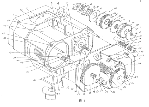 一種節(jié)能安全的微型電動葫蘆(圖1)包括具有第一殼腔(47)的主殼體(49)、配置在主殼體(49)一端的具有第二殼腔(52)的第一罩殼(1)、配置在主殼體另一端的具有第三殼腔(53)的第二罩殼(24)和彼此平行地并且以臥置狀態(tài)地設(shè)置在第一殼腔(47)中的滾筒機(jī)構(gòu)(51)和電機(jī)(2),其特征在于:電機(jī)(2)為直流永磁電機(jī);第三殼腔(53)內(nèi)設(shè)置有一用于對滾筒機(jī)構(gòu)(51)實施制動的并且對滾筒機(jī)構(gòu)(51)超限吊重作出響應(yīng)的制動機(jī)構(gòu)(54),該制動機(jī)構(gòu)(54)分別與滾筒機(jī)構(gòu)(51)和電機(jī)(2)傳動聯(lián)結(jié)。(北京凌鷹)