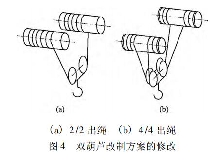 可知,當(dāng)鋼絲繩直徑和滑輪直徑確定后,鋼絲繩之間距離越大,能夠正常起升的大高度越高。這樣,可通過在吊鉤組水平方向增加滑輪的方式增大L值,來避免鋼絲繩纏絞的現(xiàn)象。雙葫蘆改制方案中的2 /2和4 /4出繩方案可變?yōu)閳D4所示的結(jié)構(gòu)。