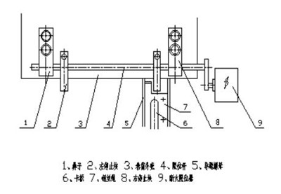 導繩器在有繩槽的卷筒上,隨卷筒轉動而作軸向移動,以保證鋼絲繩在卷筒上排列整齊。當吊鉤上升到級限位置時(吊鉤外殼與卷筒外殼之間的離距應≥500mm),導繩器裝置的卡板磁撞右停止塊,推動限位桿往右移動,從而切斷電機電流。當吊鉤下降到極限位置時。導繩器裝置的卡板碰撞左停止塊,推動限位桿往左移動,從而切斷電機電流,這樣確保的電動葫蘆安全行。導繩器裝置和限位裝置示意圖見圖10。