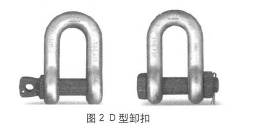 如圖2、3所示,在起重吊裝索具中,卸扣屬于連接件。一般起重用的D型和弓型卸扣均由鍛造制成。卸扣由扣體、銷軸等易拆卸的零件裝配成的組合件,由圖2、3可知,左側卸扣的銷軸為w型帶孔和抬肩的螺紋銷軸,右側卸扣的銷軸為X型六角頭螺栓型銷軸,并配有六角螺母和開口銷。兩種形式的卸扣安裝時,均需先將銷軸穿人卸扣本體左側環(huán)眼至另一端,W型直接擰入卸扣本體緊定,X型需將螺母旋緊緊定或插開口銷緊定。卸扣裝卸時,均需作業(yè)人員雙手操作,且均需要一定的緊定或拆卸時間。