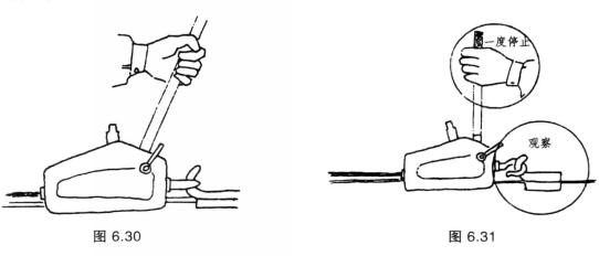 ⑧鋼絲繩固定端,必須確認(rèn)其穩(wěn)定程度或強(qiáng)度,為此,在扳動前進(jìn)桿使被牽引物體剛剛受力時要一度停止扳動,觀察固定端及鋼絲繩有無異常,確認(rèn)無異常后方可繼續(xù)操作,如圖6.31所示。