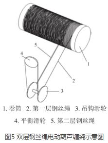 采用4/2倍率繞繩方式,由于第一層鋼絲繩與第二層鋼絲繩在卷筒上有高低差(即鋼絲繩直徑差),卷筒轉(zhuǎn)動(dòng)時(shí),上下兩層鋼絲繩進(jìn)出繩速度會(huì)不一致,因此,通過增加一個(gè)平衡滑輪,調(diào)整繩速,使起吊平穩(wěn),解決了以往2臺(tái)電動(dòng)葫蘆并聯(lián)時(shí)容易出現(xiàn)的出繩和入繩不同步的現(xiàn)象,提高了鋼絲繩電動(dòng)葫蘆的使用壽命。