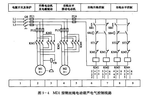 MD1型鋼絲繩電動葫蘆是一種輕小型起重設(shè)備。它可以飯莊在葫蘆單梁、橋式起重機(jī)、門式起重機(jī)、懸掛起重機(jī)等機(jī)械上,實(shí)現(xiàn)精密裝卸、砂箱合模、機(jī)床檢修等精細(xì)作業(yè)。MD1型鋼絲繩電動葫蘆電氣控制線路如圖9-4所示。