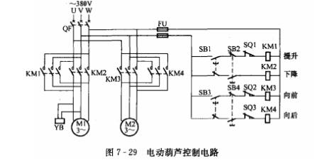 電動葫蘆是一種小型起重機械,多用于設(shè)備的吊裝工作是工廠常用的移動工具之一,起重葫蘆葫蘆由吊鉤和移動行車兩部分組成,吊鉤的提升和行車行進各有一臺電動機推動。提升電動機帶動滾筒轉(zhuǎn)動,從而帶動吊鉤的提升或下降;行進電動機拖動提升機構(gòu)在工字梁上水平移動,從而帶動行車前進或后退。其控制電路如圖7-29所示。