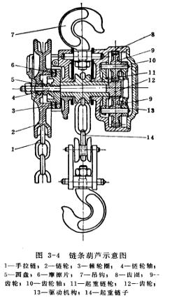 圖3-4為齒輪式手拉鏈條葫蘆。當(dāng)提升重物時(shí),手拉鏈1使鏈輪2按順時(shí)針方向轉(zhuǎn)動(dòng)。鏈輪2沿著圓盤5套筒上的螺紋向里一動(dòng),而將棘輪圈3和摩擦片6都?jí)壕o在鏈輪軸4上(鏈輪軸4與圓盤5牢固形成一體),棘輪圈3只能順時(shí)針方向轉(zhuǎn)動(dòng),棘爪在棘輪圈3上跳動(dòng)發(fā)出嗒嗒之聲。鏈輪軸4右端的齒輪12帶動(dòng)齒輪9(或稱行星齒輪)與固定齒圈8相嚙合,使齒輪9沿鏈輪軸4為中心順時(shí)針方向移動(dòng)。同時(shí)帶動(dòng)驅(qū)動(dòng)機(jī)構(gòu)13和起重鏈輪11轉(zhuǎn)動(dòng),使起重鏈子14上升。當(dāng)不拉手拉鏈之后,重物是靠自重產(chǎn)生的自鎖現(xiàn)象和棘爪組織棘輪圈3逆時(shí)針方向轉(zhuǎn)動(dòng)而停止在空中。反之,當(dāng)松下重物時(shí),手拉鏈1使鏈輪2和圓盤5分離。則鏈輪軸4右端的齒輪12帶動(dòng)齒輪9與固定齒圈8相嚙合,使齒輪9沿鏈輪軸4為中心逆時(shí)針方向轉(zhuǎn)動(dòng),同時(shí)帶動(dòng)驅(qū)動(dòng)機(jī)構(gòu)13和起重鏈輪11轉(zhuǎn)動(dòng),使起重鏈子14下降。當(dāng)不拉手拉鏈之后,因鏈輪2停止轉(zhuǎn)動(dòng)時(shí),起重鏈輪11受重物自重還要繼續(xù)沿逆時(shí)針方向轉(zhuǎn)動(dòng),行星齒輪傳動(dòng)機(jī)構(gòu)同樣沿逆時(shí)針方向繼續(xù)轉(zhuǎn)動(dòng),使圓盤5、摩擦片6及棘輪圈3相互之間相互壓緊而產(chǎn)生摩擦力,棘輪圈3受棘爪阻止不能向逆時(shí)針方向轉(zhuǎn)動(dòng),于是摩擦力作用在螺紋上產(chǎn)生自鎖,使重物停止在空中。