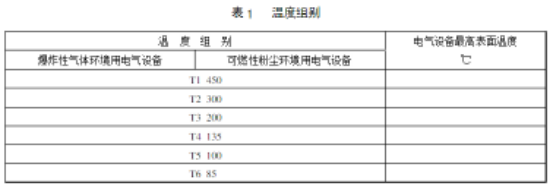 II類和粉塵類防爆葫蘆電氣設(shè)備的極限溫度分組,見表1。