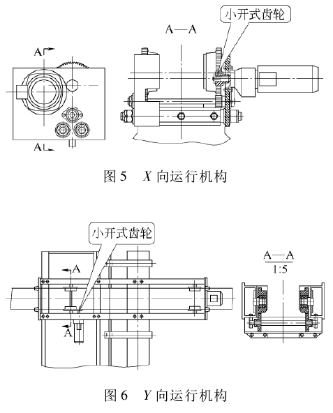 X、Y運行機構(gòu)采用H型鋼運行軌道,為解決輪壓分布不均勻,易打滑的現(xiàn)象,車輪采用小開式齒輪—+同步開式齒輪裝置傳動的形式,運行機構(gòu)采用三合一減速電動機,結(jié)構(gòu)簡單,運行平穩(wěn),安全可靠。X、Y運行機構(gòu)見圖5和圖6。