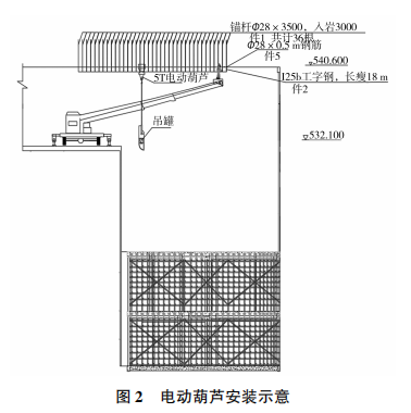 在抽水蓄能電站地下廠房土建及機(jī)電設(shè)備安裝施工過程中,因施工場地空間受限,導(dǎo)致材料垂直運(yùn)輸通道單一影響現(xiàn)場施工進(jìn)度。為解決此類問題,利用電動葫蘆具有體積小、自重輕、操作簡單、使用方便等特點(diǎn),采用在副廠房頂拱巖體位置安裝電動葫蘆、副廠房各樓層預(yù)留吊物孔的方式,形成副廠房臨時(shí)垂直運(yùn)輸通道,滿足土建施工期模板、腳手架。機(jī)電設(shè)備安裝期空壓機(jī)氣罐、電氣盤柜等材料設(shè)備的轉(zhuǎn)運(yùn),有效利用現(xiàn)場施工空間。從而達(dá)到提升施工效率、降低現(xiàn)場施工強(qiáng)度及節(jié)約施工成本的目的。