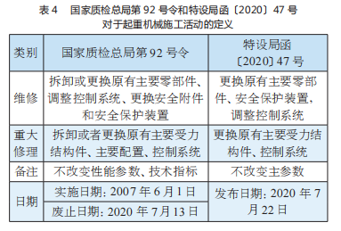 關(guān)于更換電動葫蘆的施工定性,主要由《起重機(jī)械安全監(jiān)察規(guī)定》(國家質(zhì)檢總局第 92 號令)和之后發(fā)布實施的《市場監(jiān)管總局特設(shè)局關(guān)于明確起重機(jī)械有關(guān)名詞術(shù)語含義的通知》(特設(shè)局函〔2020〕47 號)這兩個文件予以規(guī)定,具體定義詳見表 4,其中國家質(zhì)檢總局第 92 號令已廢止。根據(jù)上述文件的定義說明,對于更換同規(guī)格電動葫蘆的行為,根據(jù)國家質(zhì)檢總局第 92 號令屬于重大修理,根據(jù)特設(shè)局函〔2020〕47 號屬于一般修理。