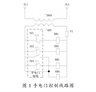 手電門控制電動(dòng)葫蘆的控制器線路圖如圖1所示,急停開關(guān) SB1 拔起后接觸器 KM1 得電,電動(dòng)葫蘆動(dòng)力電上電,SB2 和 SB3 為雙擋按鈕,通過操作按鈕控制電動(dòng)葫蘆以低速或高速進(jìn)行上升或者下降運(yùn)行,手電門通過移動(dòng)電纜和牽引繩懸掛在葫蘆下方隨葫蘆水平方向一起運(yùn)行。