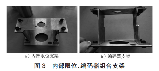 為了滿足在緊湊的環(huán)鏈葫蘆殼體內(nèi)部加裝機(jī)械限位開(kāi)關(guān)、編碼器的需求,需要根據(jù) ABUS 環(huán)鏈葫蘆自帶原裝限位開(kāi)關(guān)的外觀尺寸以及編碼器的安裝尺寸來(lái)設(shè)計(jì)加工固定支架。支架部件間采用可調(diào)節(jié)連接方式,立支架兩側(cè)開(kāi)挖空檔,便于人工手動(dòng)調(diào)整限位開(kāi)關(guān)。內(nèi)部限位、編碼器組合支架如圖 3 所示。